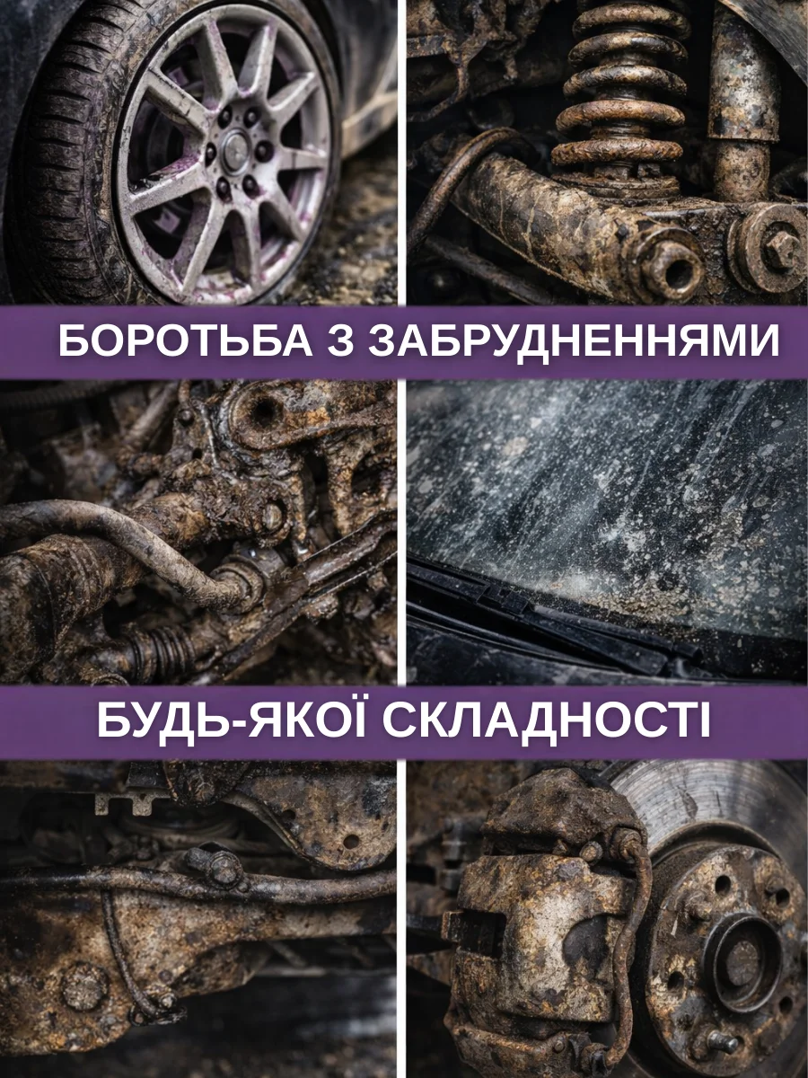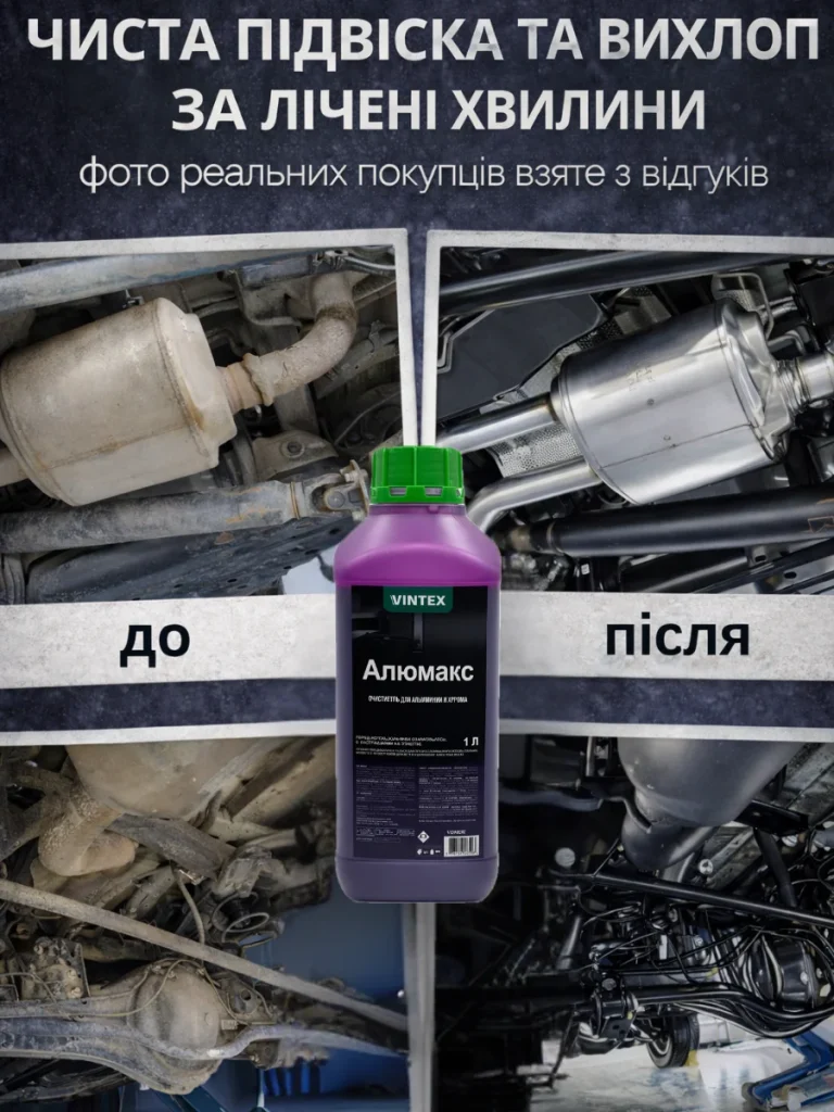 Ефективно видаляє наліт, технічні відкладення та корозійні утворення з підвіски, вихлопної системи та алюмінієвих елементів.