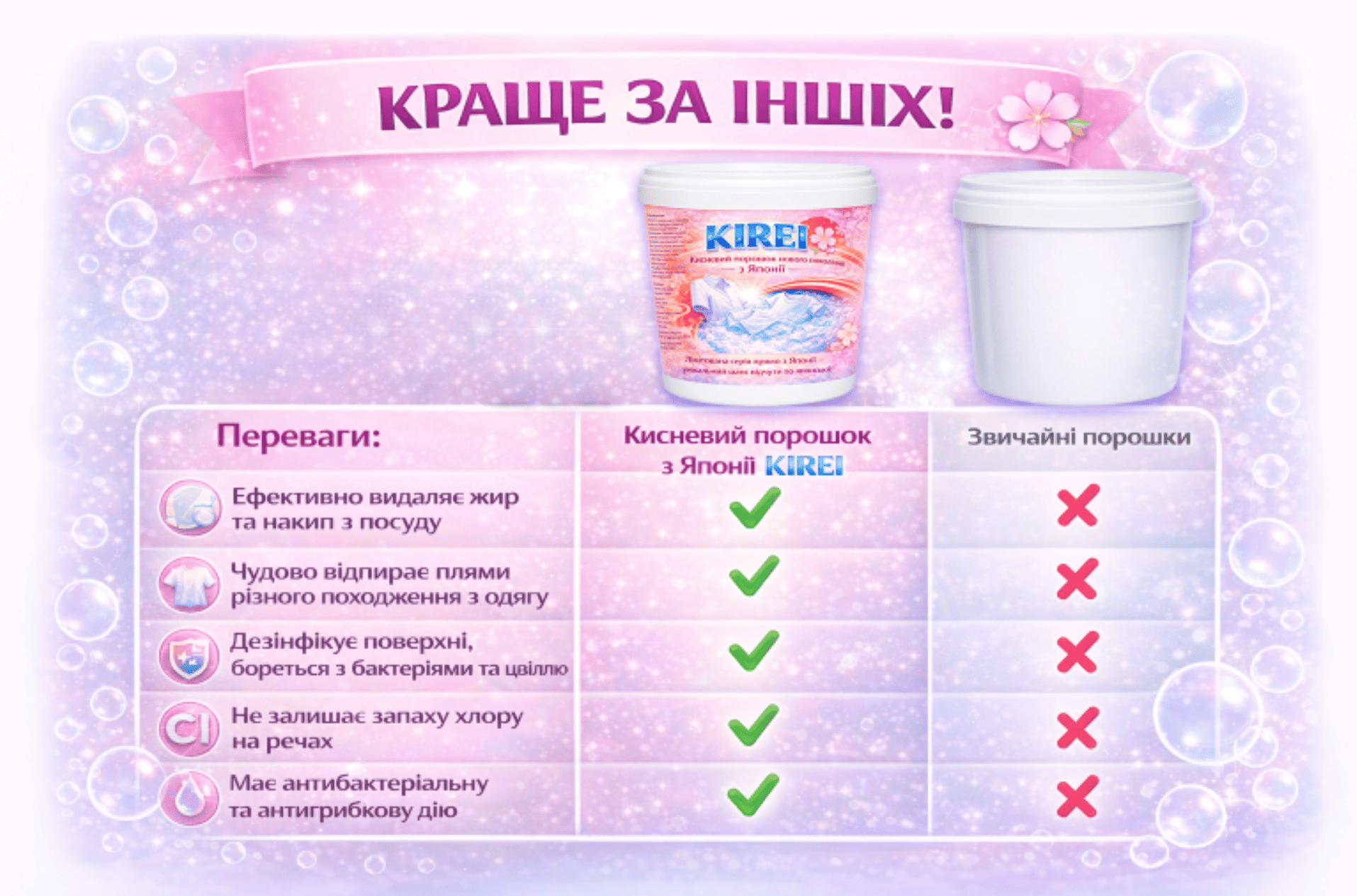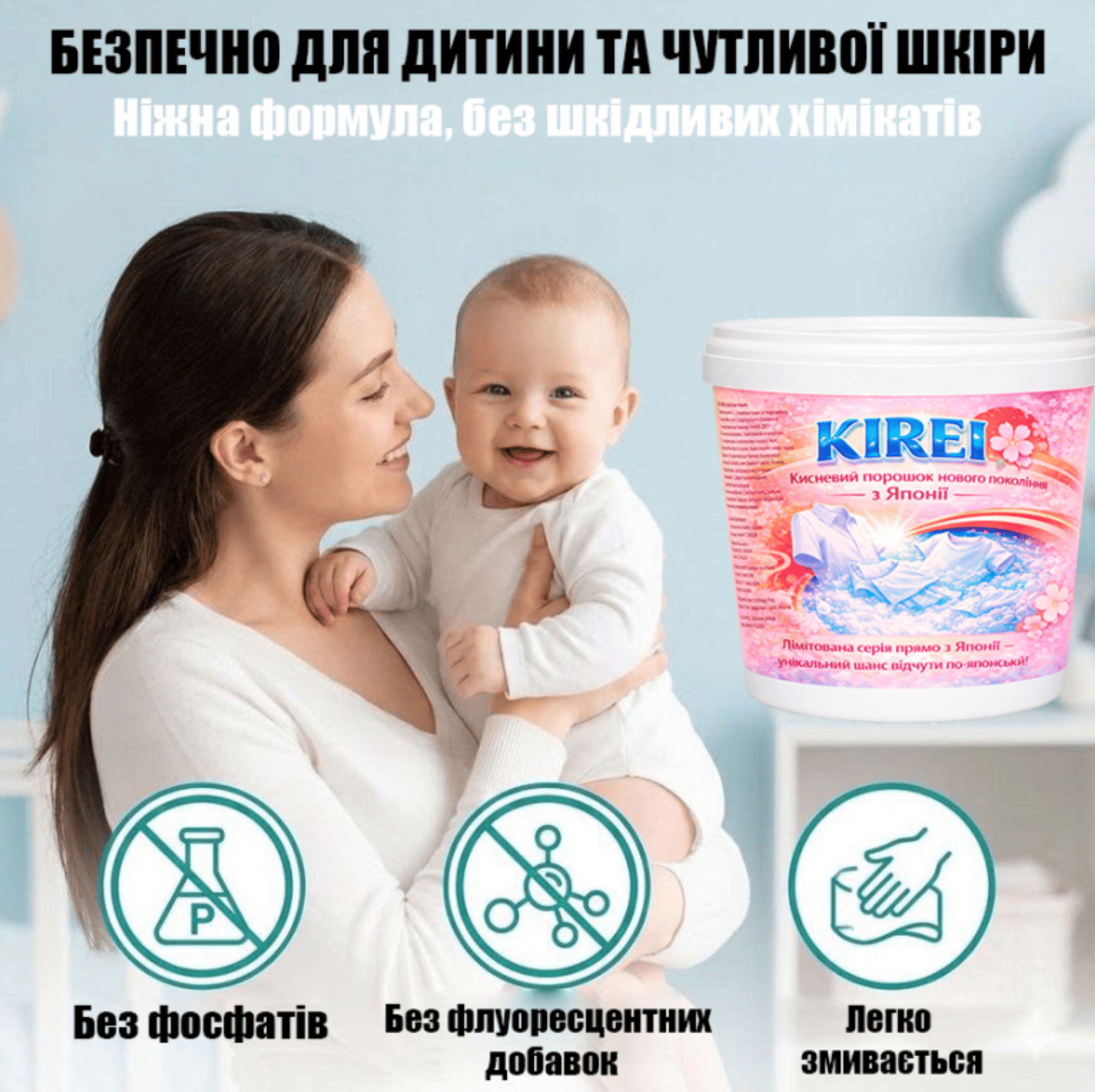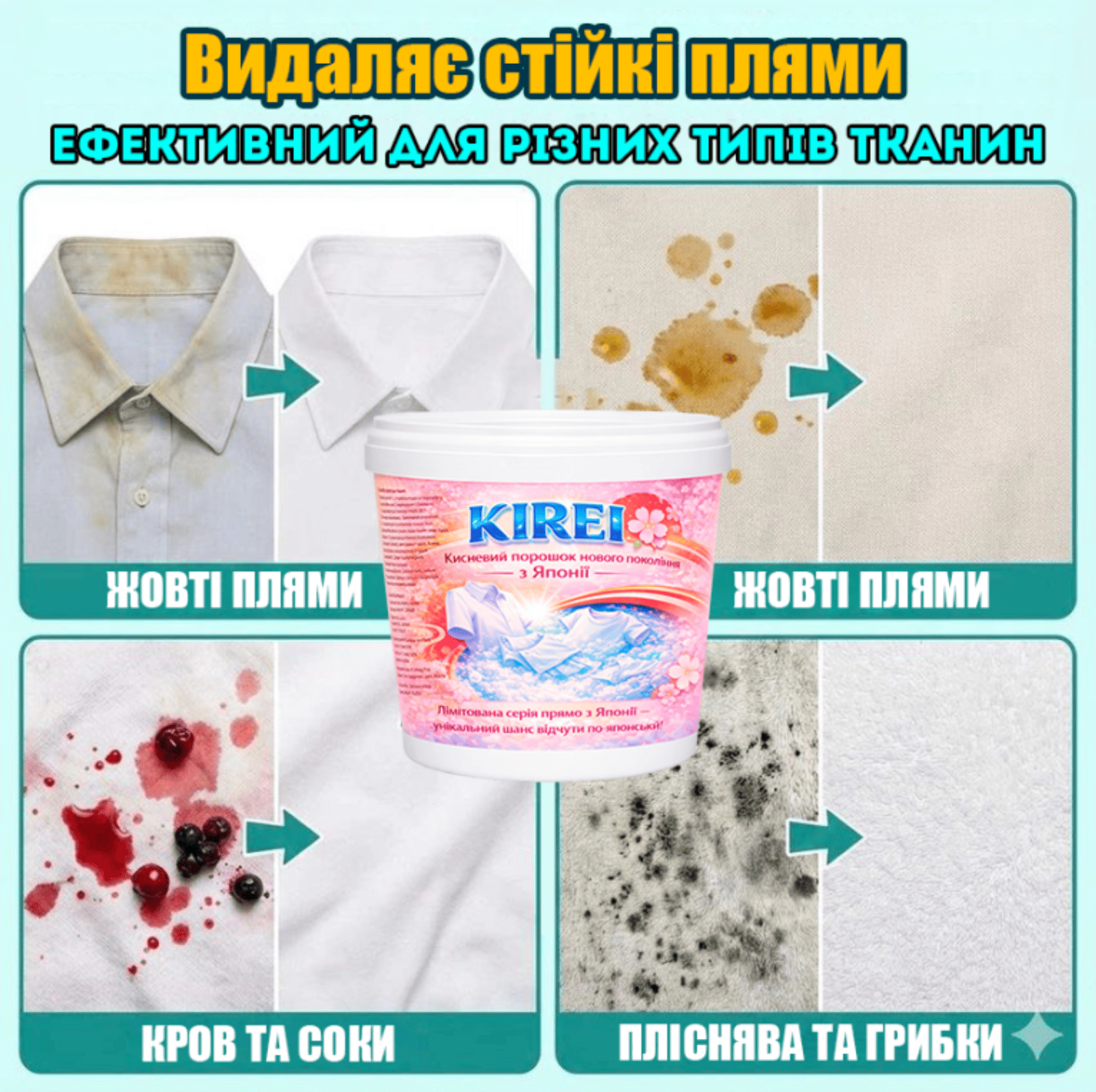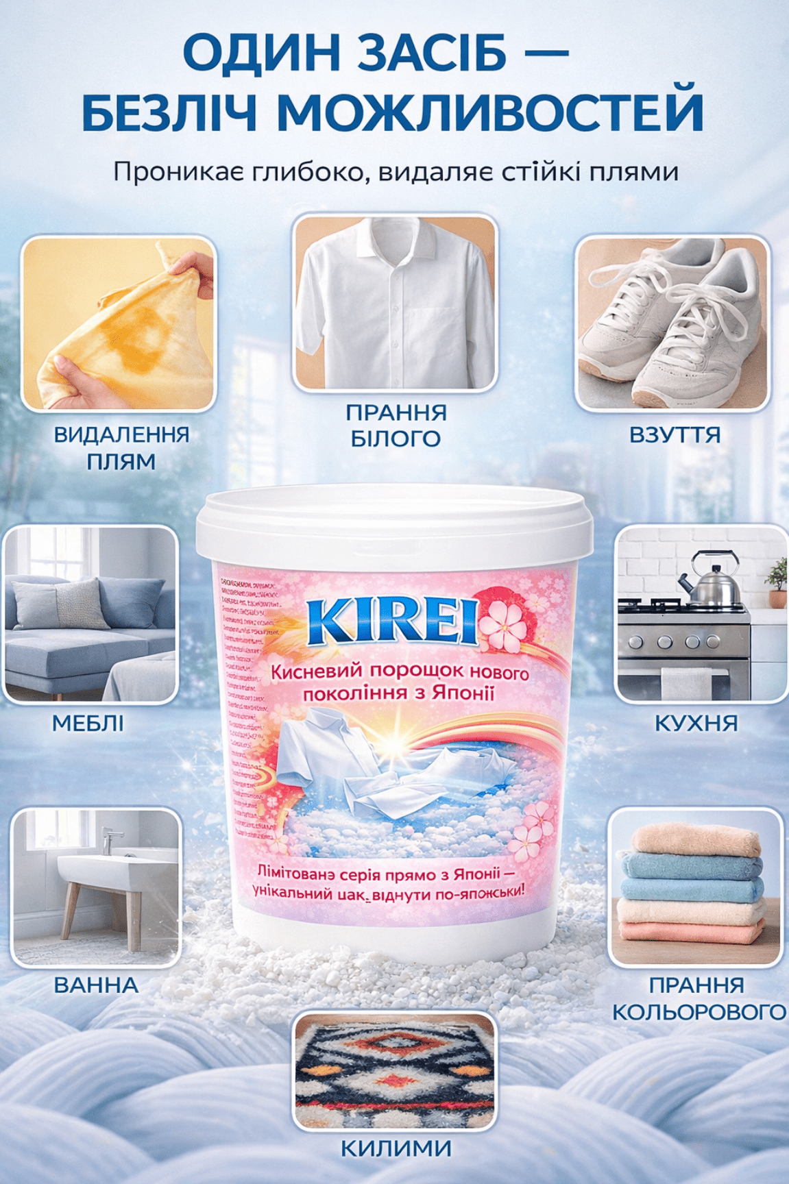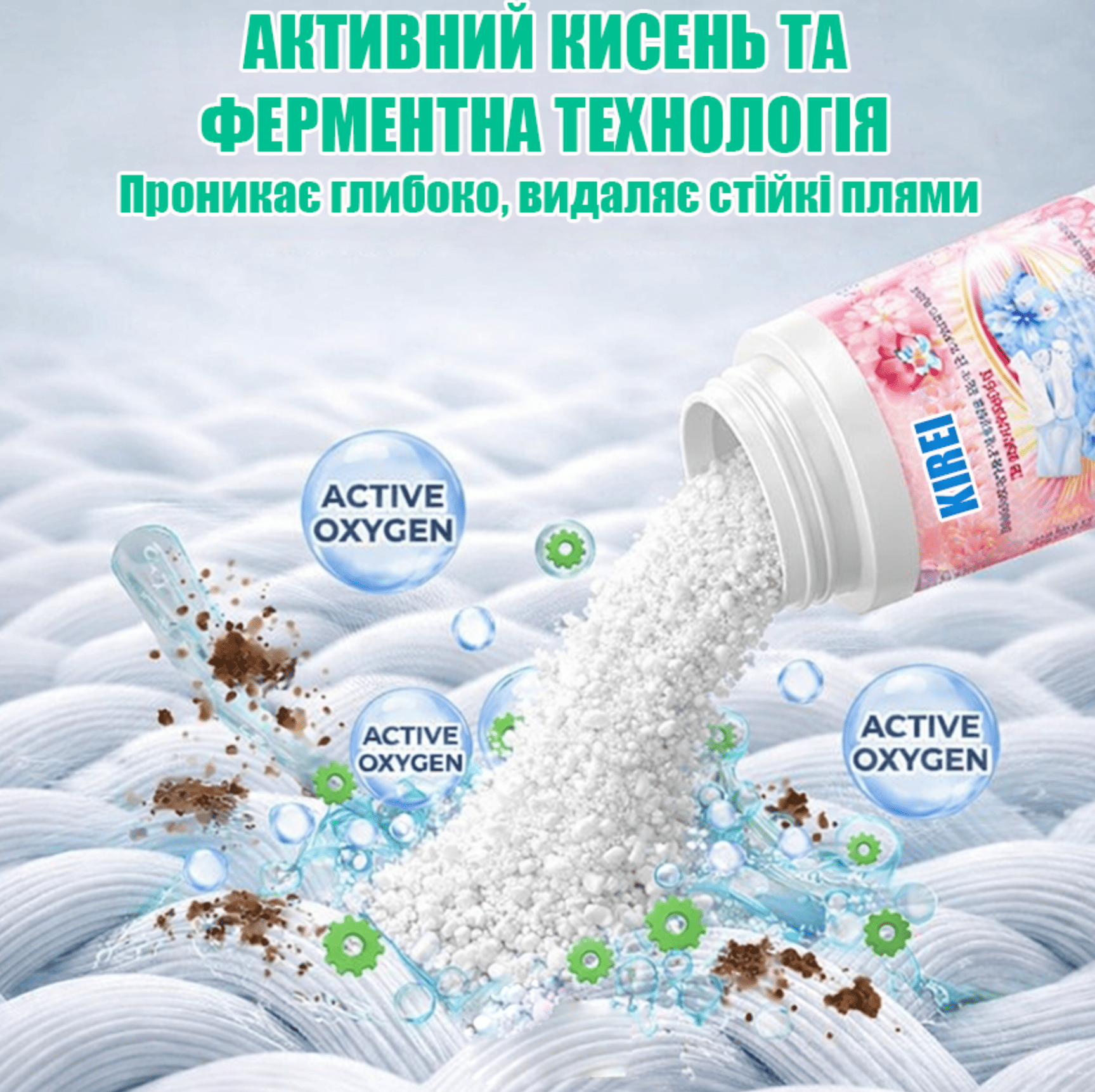 Інноваційний кисневий порошок KIREI — універсальний засіб нового покоління за японськими технологіями. Активний кисень і ферментна технологія дозволяють йому глибоко проникати у волокна та тверді поверхні, ефективно видаляючи: